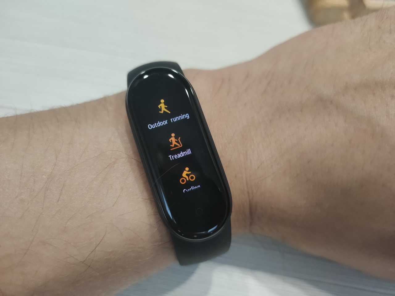 Mi Band 3 обзавёлся болшим OLED-дисплеем. Он почти в 2 раза крупнее старого, его диагональ составляет 0,78 дюйма, а разрешение 128 × 80 пикселей. Кнопки теперь нет. Надобность в ней отпала: экран стал сенсорным.