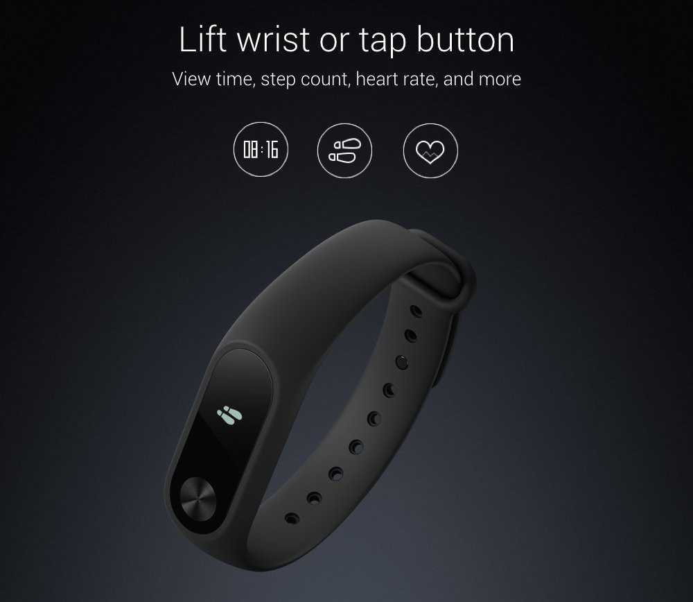 У Mi Band 2 небольшой 0,42-дюймовый OLED-дисплей с разрешением 72 × 40 пикселей. Изображение на нём довольно тусклое и его трудно разглядеть в яркий солнечный день. Ниже экрана расположена кнопка. При её нажатии активируется дисплей. На нём отображается время, пройденные шаги, расстояние, сожжённые калории, пульс пользователя, а также уведомление о звонке. Позже появилась возможность длинным нажатием на кнопку отключить звук звонящего телефона.