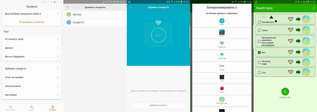 В приложение от Самсунга проинтегрирована только первая версия напольных весов Xiaomi, тем не менее существует способ добавления Mi Body Composition Scale 2 в Samsung Health. Для этого нам понадобится аж 4 программы – Mi Fit, Google Fit, Health Sync и Samsung Health. Порядок настройки выглядит следующим образом: