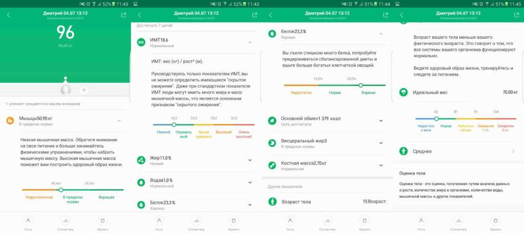 Тут можно посмотреть вес мышечной массы, индекс массы тела, процент жира и воды, процент белков, костную массу, возраст тела и ряд других параметров. При нажатии на любой из показателей – увидеть его описание, а также узнать, находится ли он в пределах нормы. Тут же можно перейти и во вкладку со статистикой взвешиваний, на которой отображается история изменения веса и жира в организме в виде графика. Или не переходить, а просто передвинуть иконку пользователя для просмотра всех предыдущих показаний.