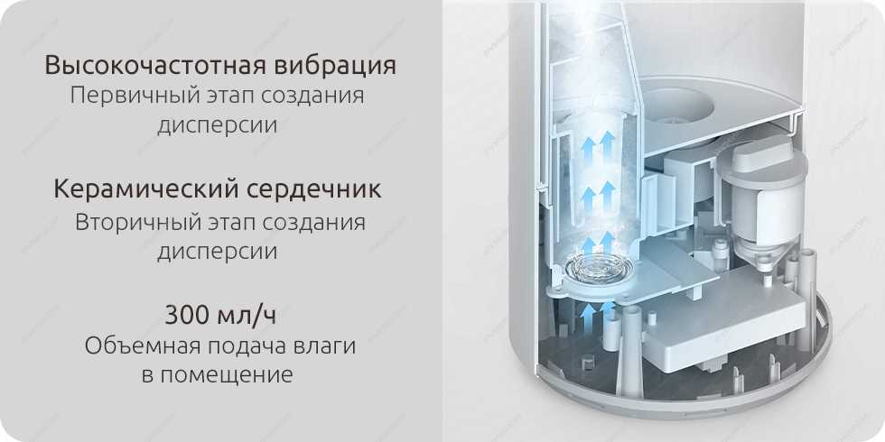 Керамическая пластина с помощью высокочастотной вибрации буквально разбивает толщу воды на капельки размером 1-5 мкм. Двигаясь дальше по воздуховодам, они распыляются в воздухе со скоростью до 300 мл/ч, проникая благодаря своему размеру даже вглубь кожи, возвращая ей естественную мягкость и шелковистость.