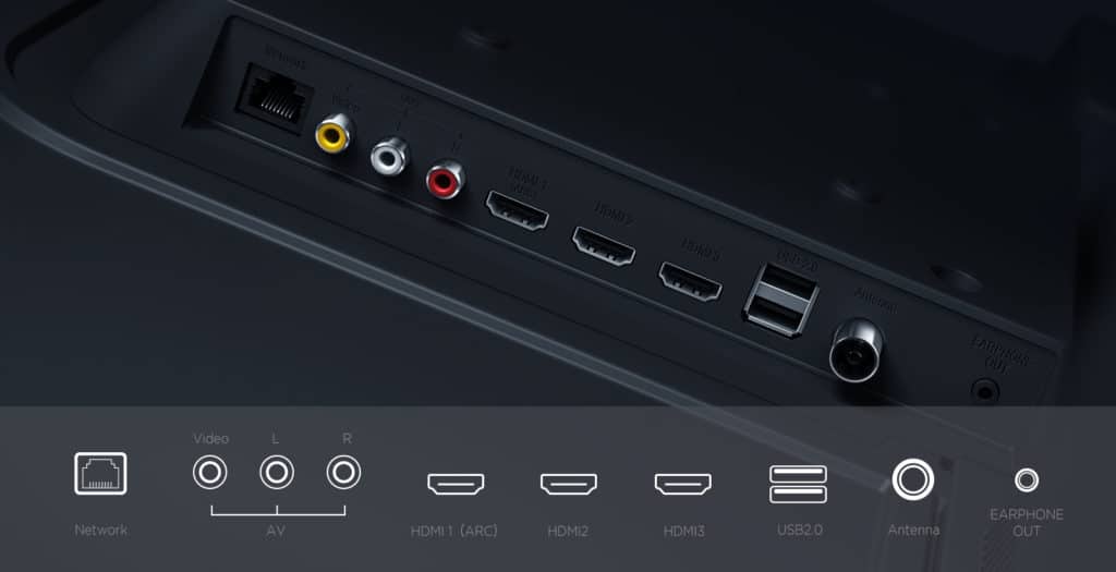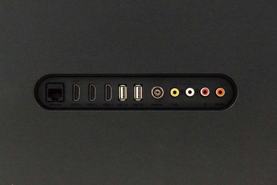 Все проводные интерфейсы устройства компактно собраны в одной небольшой выемке на задней панели Xiaomi Mi TV 4A. Здесь можно найти Ethernet порт, три полноразмерных HDMI 2.0, два USB 2.0; коаксиальный разъем для антенны, композитный вход и SPDIF. К беспроводным интерфейсам относятся Wi-Fi 802.11ac и Bluetooth 4.2.
