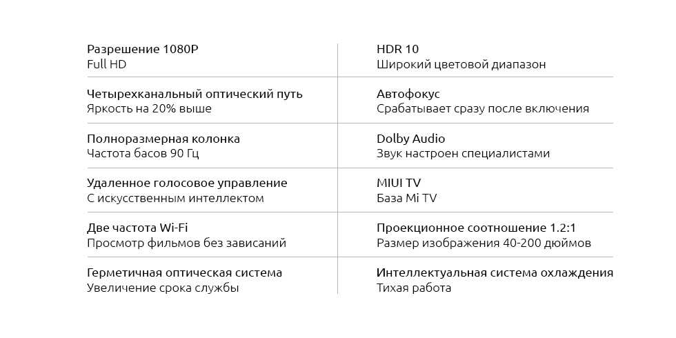 Что касается звука, то проектор оборудован стереофоническими динамиками Dolby Digital и DTS-HD. Они обеспечивают глубокий бас и четкие высокие тона. Если же вам хочется еще более качественный звук, то вы можете подключить внешнюю звуковую систему. Проектор поддерживает Bluetooth и Wi-Fi, а также китайский голосовой помощник Xiao Ai.