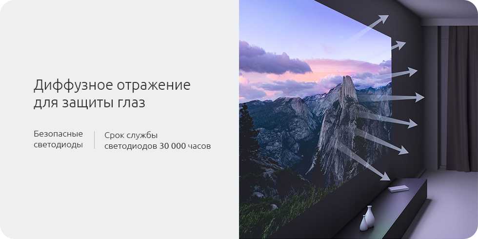 Проектор воспроизводит изображение по принципу диффузного отражения. Проецируемый свет попадает в глаза отраженным, поэтому не вызывает усталость глаз и не вредит зрению детей и пожилых людей.