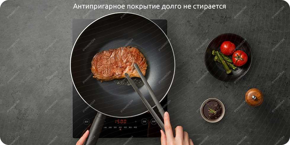 Большое плоское дно и пластина из нержавеющей стали способствуют лучшему накоплению тепла, а особое антипригарное покрытие долго не стирается и легко чистится.