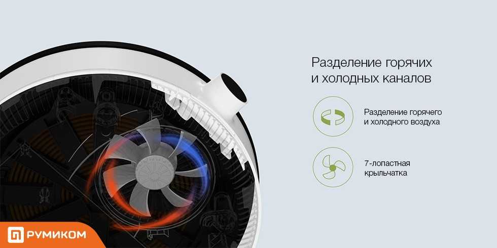 В конструкции плитки каналы для горячего и холодного воздуха разделены между собой, чтобы горячий воздух снова не поступал в систему, увеличивая нагрузку на нее. Вентилятор с 7-лопастной крыльчаткой способствует повышению эффективности теплообмена и увеличению срока службы плитки.