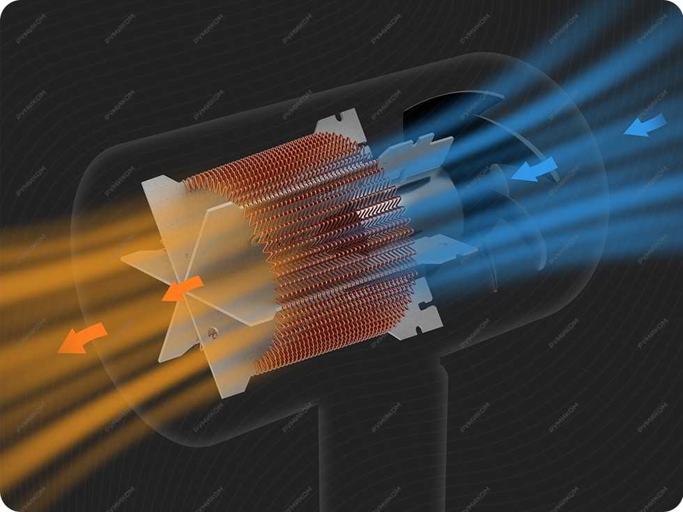 Конусное ступенчатое расположение нагревательных нитей позволяет повысить эффективность нагрева и выровнять передачу тепла, формируя выходящий поток однородной температуры. Быстрый обдув сушит волосы, при этом не перегревая и заботясь о них с использованием самого мягкого средства.
