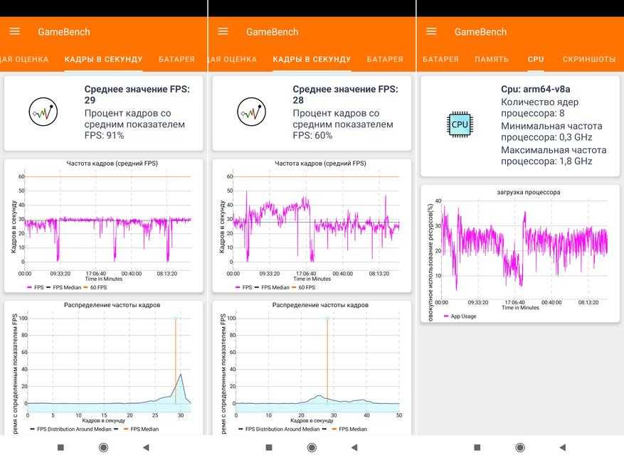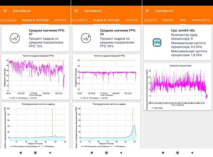 Средний fps равен 47, но во время игры могут присутствовать неприятные просадки вплоть до 30 fps (первый скриншот). Поэтому на мой взгляд целесообразно понизить настройки до средних (второй скриншот) и получить меньший, но более стабильный fps 39 (на протяжении 99% игрового времени). И нагрев при этом у смартфона гораздо меньше.