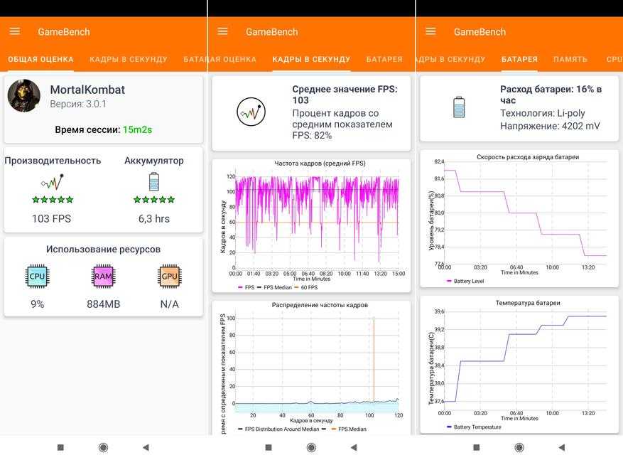 Здесь много эффектов и экшена, поэтому нагрузка на графику повыше. Частота кадров варьируется от 80 до 120 во время поединков, в среднем 103 fps (82% игрового времени). Расход батареи меньше, чем в предыдущей игре и составляет 16% в час, т.е полного заряда хватит на 6 с половиной часов игры.