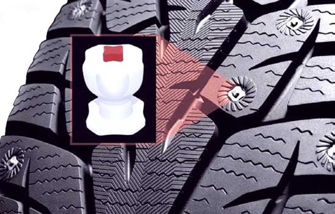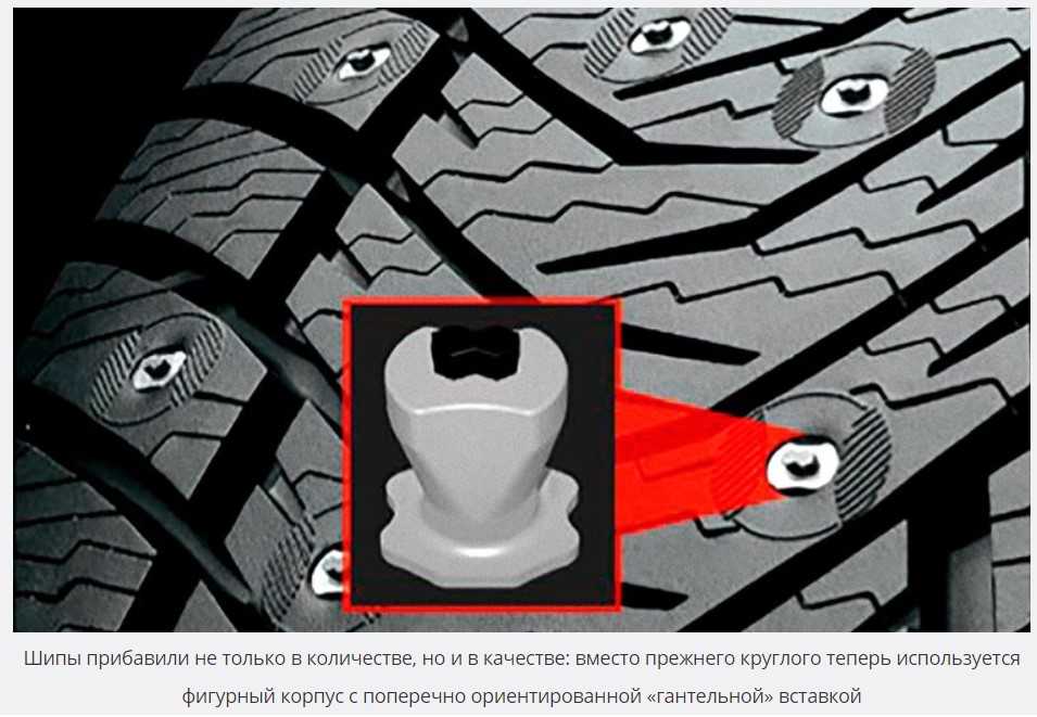 При тестировании с хорошей стороны резина показала себя именно при движении по обледеневшей трассе. Отличные тормозные характеристики обеспечиваются мощным фигурным корпусом шипов. Он представляет собой продолговатую вставку имеющую форму гантели. На более ранних моделях использовалось всего 128 шипов. Сегодня – 172.