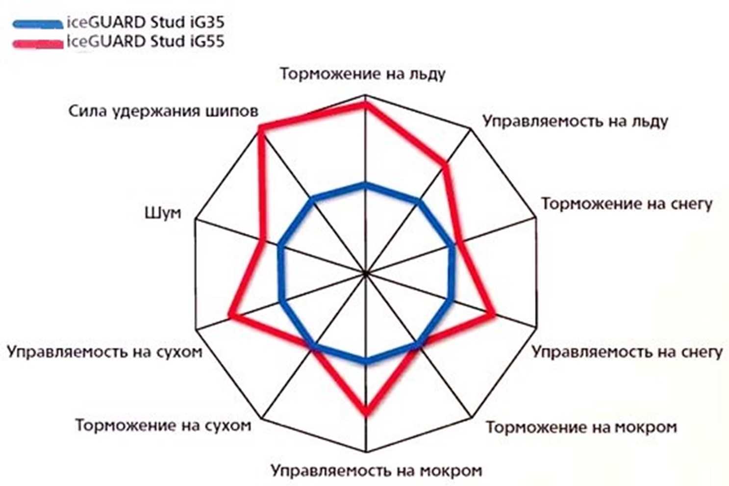 Так как в основе IG55 лежат IG35 одним из главных тестов является сравнение их характеристик. Испытания проводились как собственным научным центром Yokohama, так и независимыми иностранными экспертами. Результат в целом одинаков. Шины IG55 по всем параметрам превосходят IG35. Ознакомиться с результатами тестов резины 205 55 R16 можно на диаграмме, которая представлена ниже.