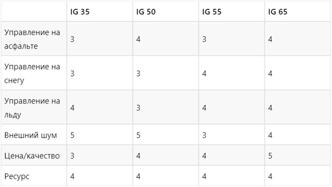Отечественные эксперты также проводили тесты IG55. Шины показали не столь радужное превосходство над предыдущим поколением, а в некоторых случаях были даже хуже. Все же все экспертизы подтверждают, что шипы у IG55 держаться намного лучше, чем у IG35. Ознакомиться с результатами испытаний можно в таблице ниже.
