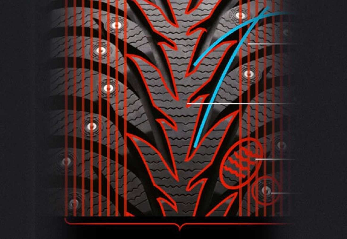 На предыдущем поколении шин, которые были взяты за основу, проблема выпадения шипов стояла очень жестко. За сезон владельцы теряли по 14-20 металлических элементов. Новый шип IG55 получил совершенно другую форму. Его фланец и сердечник выполнены в виде четырех конечной звезды. Такая форма более надежно удерживает его внутри протектора. Также увеличилось кромочное зацепление шипов.