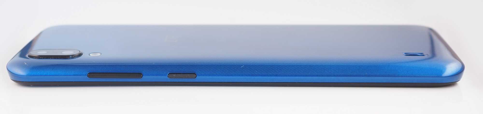 На левой грани расположен комбинированный слот для двух карт Nano-SIM или одной SIM и карты памяти microSD, на правой — качелька регулировки громкости и кнопка включения/выключения. Поддержка 4G есть на обеих SIM-картах.