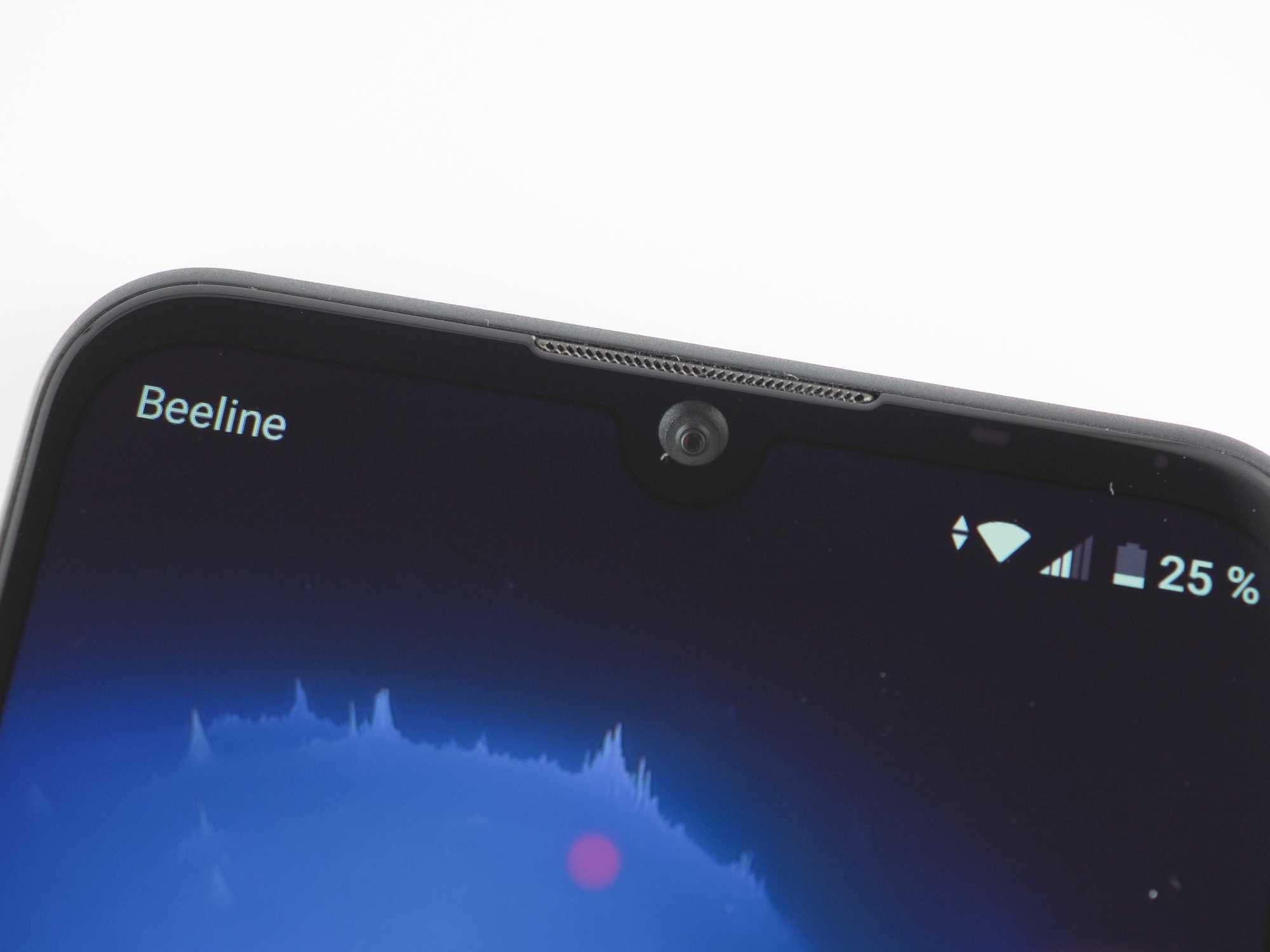 В верхней части по центру имеется каплевидная выемка под 13 Мпикс фронтальную камеру. Динамик для телефонных звонков разместился на верхней кромке аппарата. Запаса громкости хватает для общения в шумном помещении или в общественном транспорте. Справа от динамика есть точечный индикатор. Он светится красным при разрядке или неотвеченных вызовах и сообщениях.